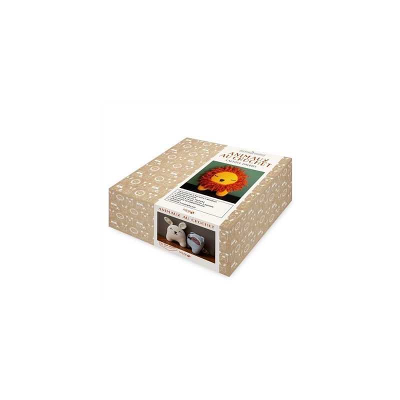 Le matériel nécessaire pour réaliser au crochet des doudous et des objets de décoration représentant des animaux avec des explications pas à pas : lion, raton laveur, ours et lapin.