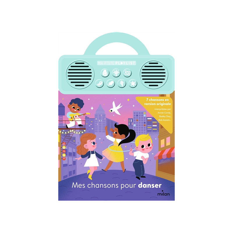 Un livre sonore en forme de radiocassette avec une poignée pour écouter sept extraits de chansons en version originale.