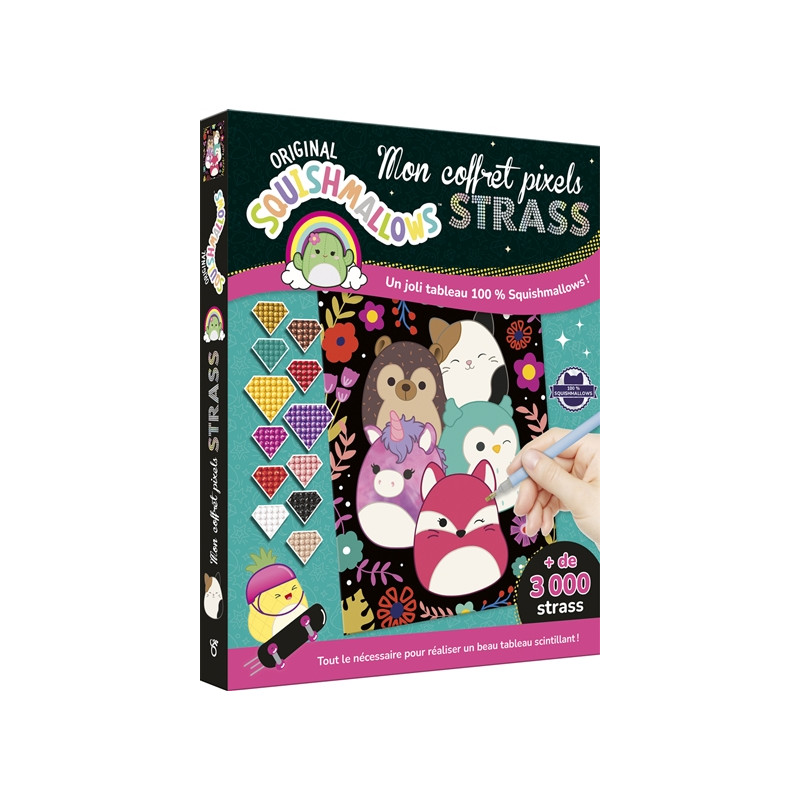 Rejoins l'équipe des Squishmallows grâce à ce kit contenant des milliers de strass répartis par couleurs, un stylet, un carré de cire et une toile adhésive.