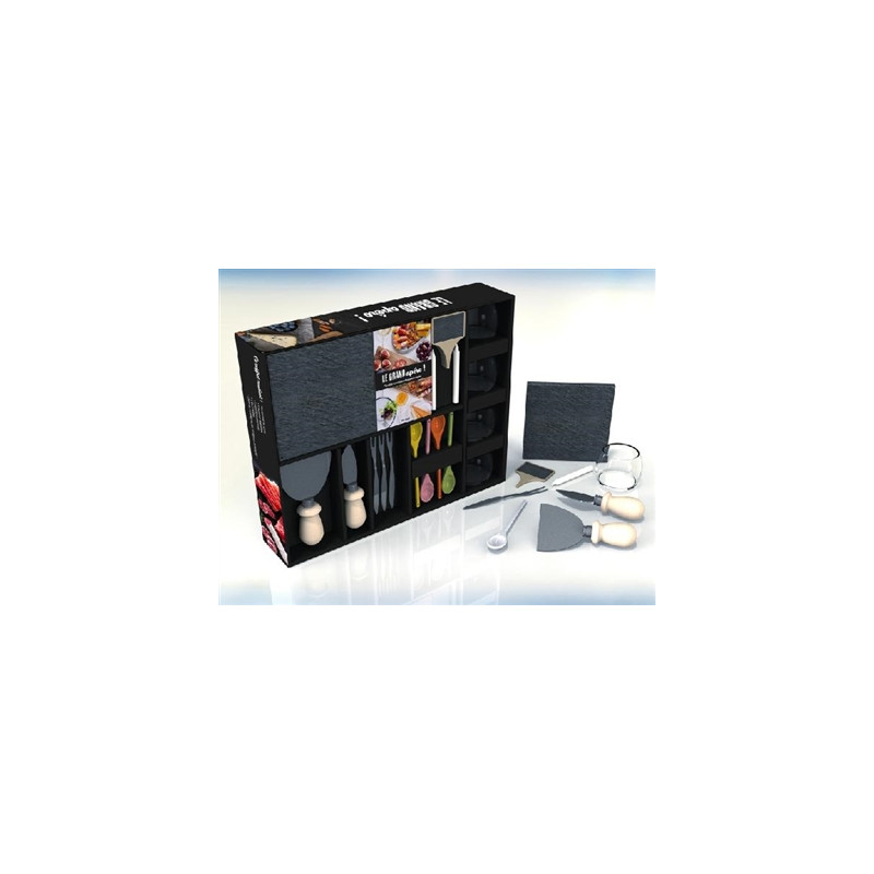 Un coffret pour organiser un apéro dînatoire constitué de planches de charcuterie, d'un plateau de fromages et de verrines.